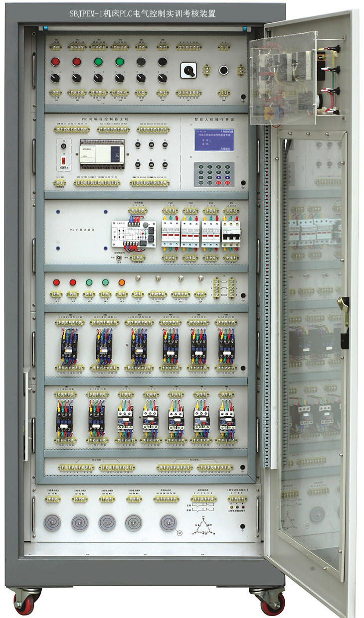 机床PLC电气控制实训考核装置、机床电气技能实训考核鉴定装置、机床电气实训设备主要功能简介:机床电气实训设备可以进行《机床排故》、《电力拖动课程》课程的实训项目,并且可作为全国职业院校技能大赛的训练场。实训室目前有硕博机床电气实训考核装置和硕博机床电气实训考核装置,两套装置电控柜正面装有车床与铣床的考核电路,反面装有磨床和钻床的考核电路,两面可同时进行实训。机床电气实训柜双面四合一型,包含:PLC模块、工业电气标准柜、控制与监控屏、机床电机系统、网络化智能考核软件系统、C6140型普通车床控制线路、C6502型普通车床控制线路、M7130K型平面磨床控制线路、M1432A型万能外圆磨床控制线路、X62W型万能铣床控制线路、T68型卧式镗床控制线路、Z3040B型摇臂钻床控制线路、M7120型平面磨床控制线路、智能考核系统,可广泛用于开设电力拖动课程及进行电工技能等级考核的学校或单位。电控柜的主体分为铣床电气线路、车床电气线路、故障设置区、电动机面板四个部分。通过一只转换开关就能实现两种机床电机切换的巧妙设计。机床PLC电气控制实训考核设备能完成铣床和车床的工作原理及动作,可以独立进行操作,学生可以在机床电气电路中进行电气故障的排除训练和演示,以达到熟悉各种故障现象。提高学生排除各种故障的动手能力。可以手动和电脑智能设置故障点两种方式选择,可实现智能实训考核功能。机床电气技能实训考核鉴定装置柜式双面四合一型,包含:PLC模块、工业电气标准柜、控制与监控屏、机床电机系统、网络化智能考核软件系统、C6140型普通车床控制线路、C6502型普通车床控制线路、M7130K型平面磨床控制线路、M1432A型万能外圆磨床控制线路、X62W型万能铣床控制线路、T68型卧式镗床控制线路、Z3040B型摇臂钻床控制线路、M7120型平面磨床控制线路、智能考核系统、电脑及电脑桌8个、胜利VC9808+数字万用表8个,每台套包含的实训设备,实训部件等。