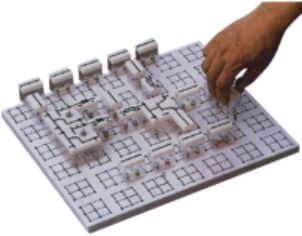 实验桌一桌两座,实验桌中央配有通用九孔万能插件板(尺寸:35×90cm ),九孔万能插件板主体由ABS注塑而成,表面布有九孔成一组相互联通的插孔,九孔万能插件板内部内嵌126组铜质九孔一体成型嵌件(共有1134孔)。实验中的弱电模块必须以独立封装的透明元件盒为单一模块,元件盒统一都能配合九孔万能插件板像搭积木一样的形式自由搭建组合电路;元件盒盒体透明,内装元件直观性好,盒盖印刷电路图防刮耐磨,符号美观清晰。元件盒盒体与盒盖采用较科学的压卡式结构,维修拆装方便。每张台桌配有一粒胶皮板,保护通用底板与桌面(如需在桌上放置电动机、焊接等)。
