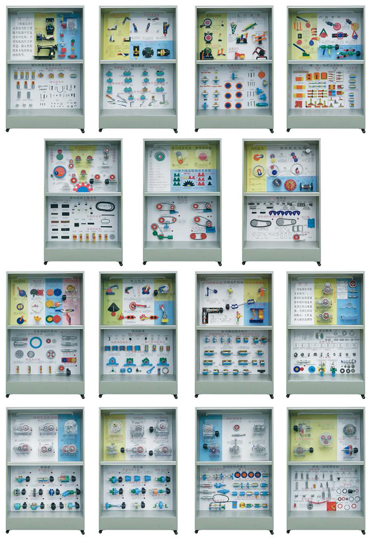 机械综合陈列柜,该设备是根据大中专院校、职业学校的教学大纲设计的多功能机械综合示教室是一套《机械原理》、《机械零件》、《减速器》共500余种模型,分三大类合并成的电化教学设备。共15个柜,30个板面。该设备采用新型触摸液晶屏电脑控制主控台。mpc解说,触摸屏、遥控控制,声控同步循环播放进行演示;又根据教材,教学需要而任意选择单独运转演示。本产品的特点:使作方便,占地面积小,结构新颖实用,制作工艺更加美观,整套设备演示形象逼真,运行可靠,有效的提升了教学生动性、趣味性及产品寿命。是一套现代化的机械课程示教室设备。