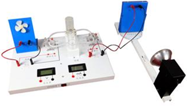燃料电池教具是利用光线照射在太阳能电池板上产生电能,然后利用产生的电能作用在电解电池模块上,使水发生电解产生氢气和氧气。氢气和氧气进入到发电模块产生电能,带动风扇转动。