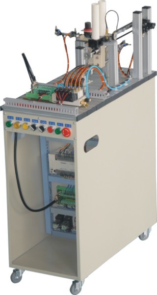 由平移工作台、塔吊臂、机械手、齿轮齿条传动、工业导轨、开关电源、可编程序控制器、按钮、I/O接口板、通讯接口板、电气网孔板、多种类型电磁阀及气缸组成,主要完成将上站工件拿起放入安装平台,将装好工件拿起放下站。