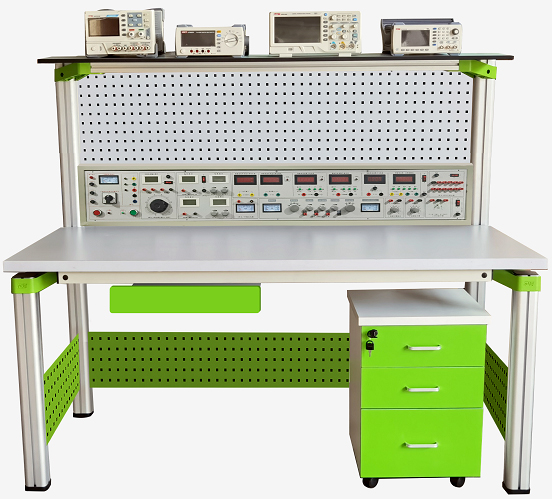 电子学实训台主要由实训主机箱、仪器架、电源控制箱、独立实训电路模块、实训桌(含磁吸式实训基座)、储存柜、学生凳等组成。