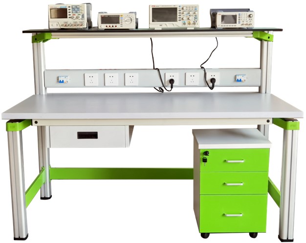 实训桌规格为1600(长)*700(宽)*1150(高),设有一个抽屉;实验桌主体结构全部采用高性能表面氧化的铝型材及一次成型铝压铸框架连接构件,连接构件采用压铸成型工艺(非焊接工艺),经机加工、抛丸、喷砂,表面静电喷涂工艺,安装方便、快捷,用户可自行DIY组装。桌体立柱采用工业铝型材成型工艺,表面氧化处理,截面尺寸:70mm×70mm,四面带槽,槽宽约8mm,端部装有注塑成型配套塑料堵头。桌面采用25mmE1级三聚氰胺饰面板,桌面板下设支撑框架,承受力不少于300kg。配备储存柜,存放元件及工具,储存柜底部4只高强度万向可制动PU脚轮,方便移动。实训装置整体简约不简单,高端大气,符合现代化产品审美和发展趋势。