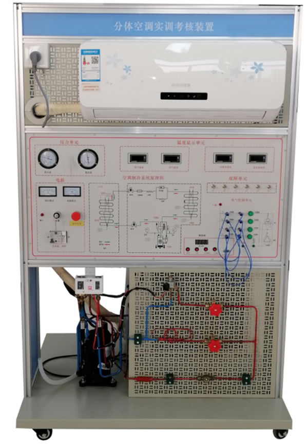2、装置直观展示了空调的系统结构和工作原理,便于教学演示讲解及学生对课本知识的理解掌握。配置的交流电压表、交流电流表、温度表、真空压力表以及相应的信号指示灯,使整个空调系统的实时工作状态一目了然;