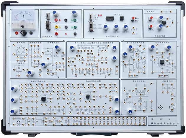 模拟电子技术实验箱由铝木合金箱体、高性能线性电源、和实验电路板组成。其中实验电路采用固定功能模块方式,电路原理和元器件符号清晰,实验用元器件可以焊装在线路板的反面,安全可靠,不易损坏,也可以装在线路板的正面,元件直观可见,感性认识强,正面还有实验电路原理图,使学生在实验时对原理一目了然。