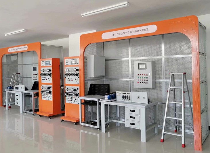 电气安装实训装置,电气安装实训设备,电气安装与维修实训装置,电气安装维修实训设备,电气安装与维修实训考核装置,电气安装与维修实训考核设备,工厂自动化行业:电气自动化设备、机电设备电气控制系统安装与调试、维修等;如:机床电气设计、安装、调试和维修、自动化生产线电气控制系统设计、安装调试和维修等。是根据工厂电气安装和室内电气安装等维修电工和电气安装工实训鉴定要求,而开发的一种通用实训平台。非常适合于各类职业院校和技工学校维修电工和电气安装工、其他有电气安装布置要求的专业的作为公共平台使用。采用钢制网孔板和钢制专用型材组接而成,安装有自锁式脚轮,方便移动和使用。装置表面喷塑,色彩稳重。装置配有专用电源台。装置设计高度以人站在一级人字梯即可方便操作的高度,既安全又能使使用者感受到施工现场环境。横向、丛向宽度合适,可以模拟现场线路的转向布置。网孔板可以方便拆下。为方便隐蔽工程施工,钢制框架仿建筑隔断用轻钢龙骨的加大宽度精心设计,带有穿管孔,使用扎带固定线管,在穿出网孔板时可以使用壁疏引出导线穿入明装底盒。配套的PVC管弯管器,可方便的对PVC管弯成90度。可进行电工安装。如桥架安装、PVC管安装、吊灯、白炽灯座、日光灯、开关、插座、配电箱、控制箱等,装置还包含有交流异步电动机、直流电动机、步进电机、、温度控制器、电偶、PLC、变频器触摸屏等控制与受控对象。该系统每个操作组配套一可移动式工具车和元件柜,便于对元件的保管和安装施工。从根本上解决了学校在普通墙面上进行的安装培训的使用不方便、实训范围窄的问题。具有组装灵活方便的特点,可以根据学校的实际教学条件组成,2人组、单面、度组合是基于20.8米的基本组合单元,辅助配有0.2米、0.4米的组合单元,形成不同的长度组合,以满足不同的教学场地。可以为水电安装工等有电气安装要求的各岗位群提供实训考核。