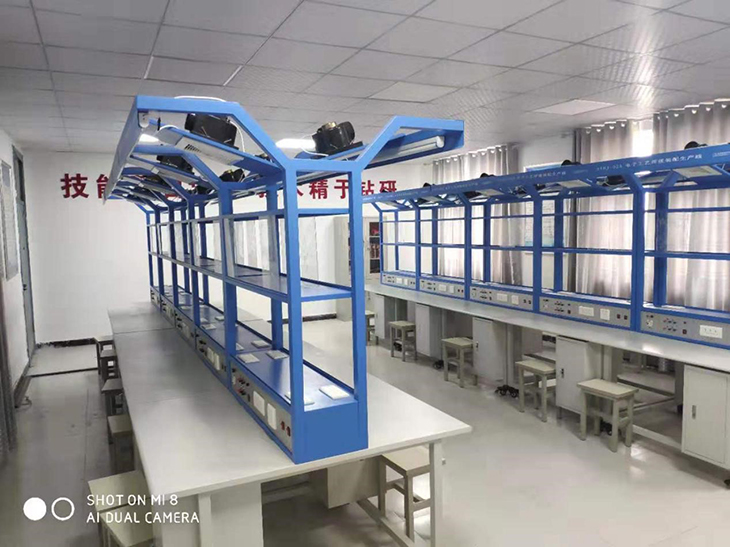 实训台上提供日光灯(用于照明)2个,透明的PVC4个,可夹放原理图等资料,另外还配备三芯双联暗插座4个、两芯暗插座2个、工具柜2个,工作台面设有绿色防静电桌垫,整个装配线安全可靠。