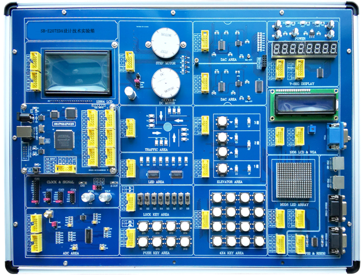 EDA设计技术实验箱、本公司EDA教学实验系统是适合工科专业进行EDA课程教学实验以及课程设计的必备工具,系统由四部分组成,包括:可编程逻辑器件(FPGA)部分、外围接口部分、扩展接口部分,实验内容丰富生动形象,能够大大的激发学生的兴趣,使学生老师在教学的过程中能够寓教于乐,同时在学习EDA的同时可以加强对控制、通信、电子电路等课程进行加深,让学生学有所得。