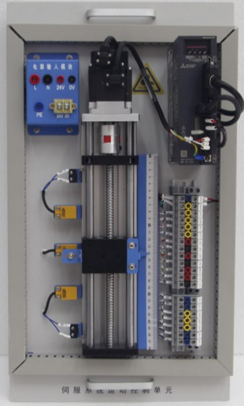 2)对象:包含滚珠丝杆、联轴器、刻度尺(0-270mm1个、限位开关(滚动式)2个、接近开关(光电)3个、安装底板、控制接口等。可完成伺服系统参数的设置、电机正反转控制、定位控制等。