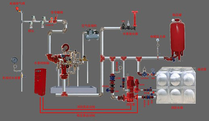保护区域出现火警时,探测系统首发动作,打开预作用雨淋阀以及系统中用于排气的电磁阀(出口接排气阀),此时系统开始充水并排气,从而转变为湿式系统,如果水势继续发展,闭式喷头开启喷水,进行灭火。这样就克服了雨淋系统会因探测系统误动作而导致误喷的缺陷。如果系统中任一喷头玻璃球意外破碎,则会从该喷头处喷出气体,导致系统中气压迅速下降,降低监控开关动作,发出报警信号,提醒值班人员出现异常情况,但预作用雨淋阀没有动作,所以系统不会喷水,从而克服了湿式系统会因喷头误动作所引起误喷造成水渍的缺陷。