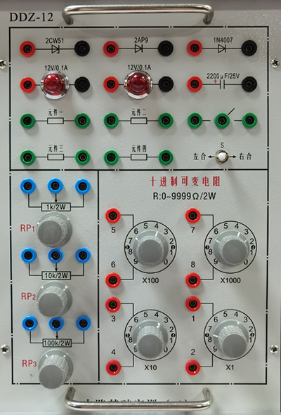 提供各种功率电阻、灯泡(12V/0.1A)、稳压管(2CW51)、二极管、电位器(1k/2W、10k/2W、100k各一只)、电阻箱(0~9Ω/2W、0~90Ω/2W、0~900Ω/2W、0~9000Ω/2W各一组)等。