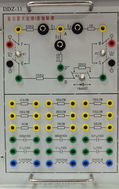 提供电阻、电感、电容、电路基础实验模块和故障按键(3个)等,完成叠加定理、基尔霍夫定律、戴维南定理、诺顿定理、电压源与电流源的等效变换、一阶、二阶电路过渡过程的研究、RLC串联谐振电路的研究等实验。