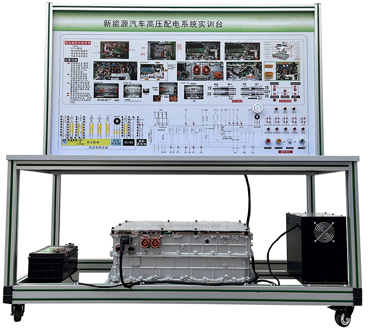 动力电池组带电池箱(24V20AH)、国标充电枪与充电座、(比亚迪E5)高压配电箱(带各类高压继电器)、漏电传感器模块、绝缘传感器模块、安全维修塞模块、漏电模拟操作单元、高压安全系统操作单元、操作控制台、训练控制按钮、直流接触器(包含充电继电器、总正继电器、总负继电器、预充继电器)、辅助蓄电池(12V45AH)、一体化全铝合金型材搭建的移动台架(1500×700×1700mm