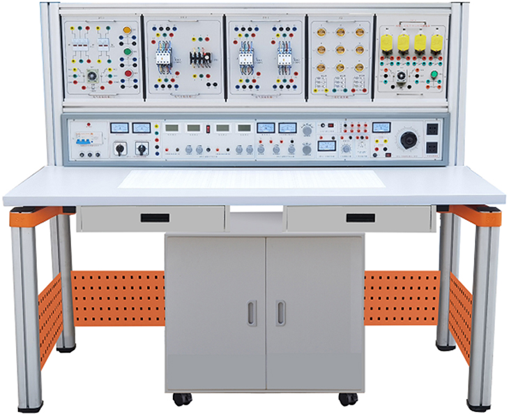 装置由主机箱、实验桌、移动矮柜、电气控制实验挂箱、实验挂箱支架、学生凳等组成。实验桌可组合、可拆装。支架与桌脚一体,铝合金结构;电气控制实验挂箱及各实验模块可根据实验需求自由组合实验。