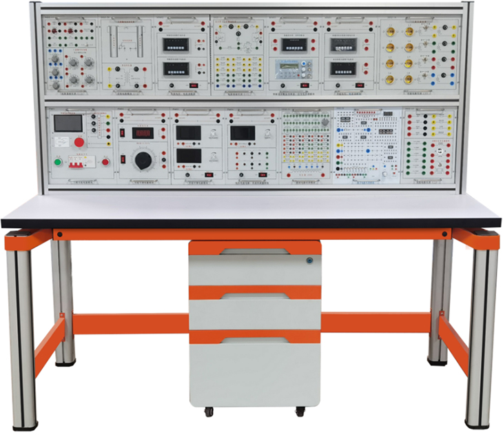四、电工实验台主要配置及功能:实验平台由实验桌、实验台架、存储柜、实验挂箱组件、配件等组成。