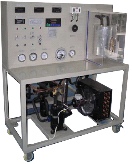 1.实验台:采用双层亚光密纹喷塑结构,造型新颖。最上层布置制冷系统,可直观展示制冷系统结构;正面设有电源控制及测量仪表功能板。底部装有四个带刹车的万向轮,便于移动和固定。