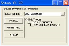 (1)运行“372drive”文件夹中的USB驱动程序CH372DRV.EXE。在图1中的界面选择INSTALL,完成USB口驱动的安装。