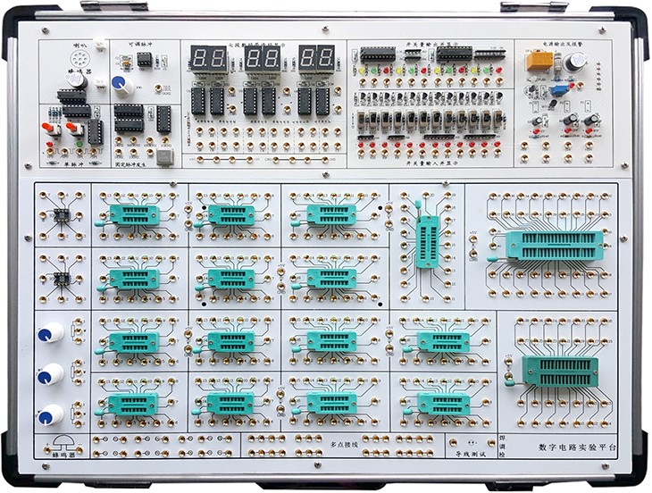 数字电路实验箱,数字电路实验室,数字逻辑实验箱、数字电路实验装置、主要用于开设电子信息科学与技术、自动化和机电一体化三个专业的《数字电子技术实验》或《数字电子技术基础实验》课程,该课程是相应的《数字电子技术》或《数字电子技术基础》理论课程中重要的实践环节。课程的任务是通过实验,使学生加深对所学理论课程内容的理解,激发学习兴趣,从实践上验证所学的理论知识;培养学生的实际动手能力、解决问题能力和设计数字电子电路的初步能力。数字电路实验箱由铝木合金箱体、开关电源、常用信号源和实验电路区组成。其中实验电路区采用全开放模式,可根据需求灵活配置实验电路,以满足不同层次学生的教学实验要求。