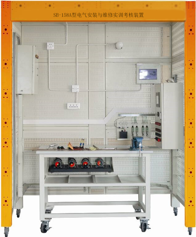 电气安装与维修实训考核装置,可进行电工安装。如桥架安装、PVC管安装、白炽灯座、日光灯、开关、插座、配电箱、控制箱等,装置还包含有交流异步电动机、直流电动机、步进电机、伺服电机、温度控制器、电偶、PLC、变频器触摸屏等控制与受控对象。该系统每个操作组配套一可移动式工具车和元件柜,便于对元件的保管和安装施工。从根本上解决了学校在普通墙面上进行的安装培训的使用不方便、实训范围窄的问题。