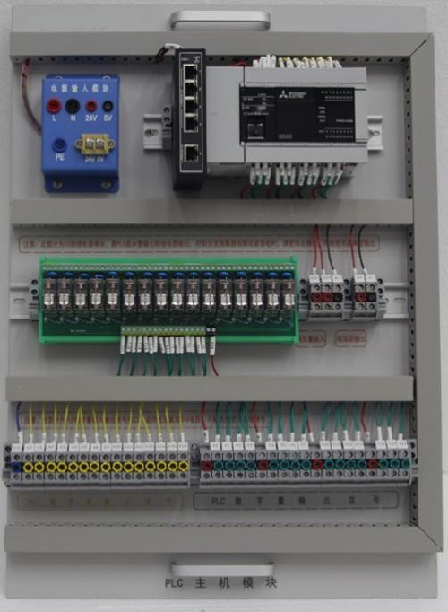 1)面板采用4种颜色(包含黄、绿、红、黑色)字符线条彩色印刷,区分不同输入信号。色泽美观并经久耐磨不掉色;配有线槽,用于工业接线工艺训练;