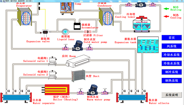 (3),系统故障运行演示:在配置有实物中央空调实训考核装置时,在软件演示故障时系统动画与实物实时故障同步,让学生更好地撑握空调原理、操作方法,如压缩机系统、制冷系统、制热系统、风系统、集中送风系统、半集中送风系统的原理过程。