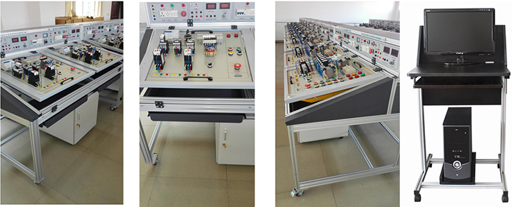 实验操作面:采用工业铝型材,连接实验台与电源控制屏,与实验台成36度斜面。内置机床电气模块放置区,采用钢材做骨架,外表面喷涂彩色环氧聚塑。