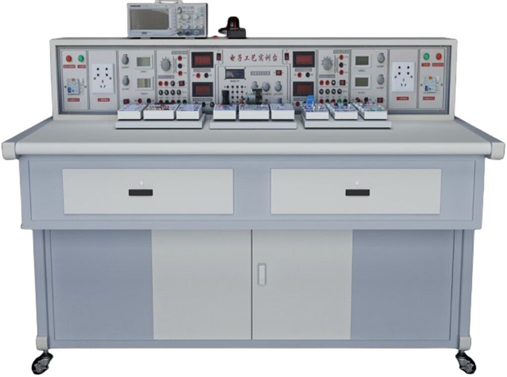 实训桌为铁质双层亚光密纹喷塑结构,桌面为防火、防水、耐磨高密度板,结构坚固。实训桌下方设有柜子,可以放置实训模块和工具以及资料等,还设有四个带刹车的轮子,便于移动和固定。