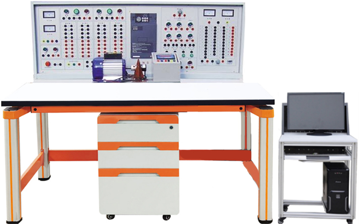 实训装置由控制屏、实训桌、变频实训组件、继电接触实训组件、数字量/模拟量输入输出给定指示组件、三相异步电机、电机导轨、测速机构等组成。