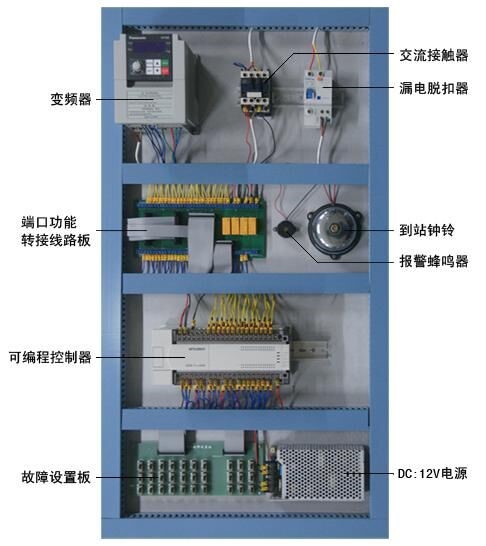3.电气控制部分:电源空气开关(漏电脱扣器)、DC12V驱动电源、PLC可编程控制器、接线端口电路板、到站钟等。