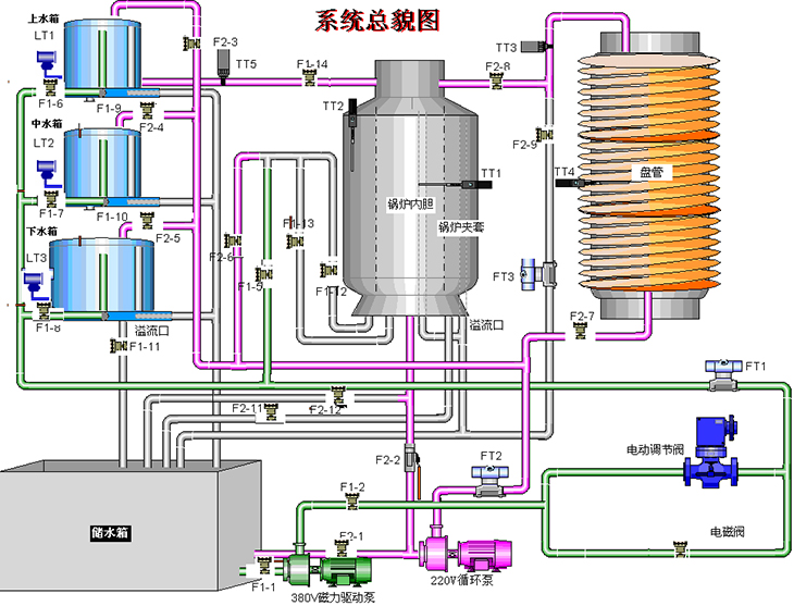 实验对象系统包含有:不锈钢储水箱;上、中、下三个串接有机玻璃圆筒型水箱;三相4.5kW电加热锅炉(由不锈钢锅炉内胆加温筒和封闭式外循环不锈钢冷却锅炉夹套构成)和铝塑盘管组成。