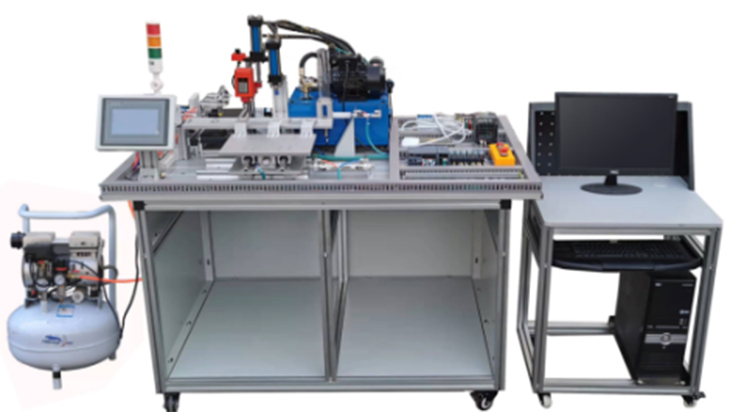 机电液气一体化综合实训考核装置实训工作台架为铝合金型材结构,在上面可安装上料单元、间歇式传送及夹紧单元、冲压单元、钻孔单元和分拣单元,并配有PLC主机、变频器、触摸屏、传感器、三相异步交流电机、交流减速电机、直流电机、液压机系统、钻机及其液压进给系统、气压传动系统等,构成一个典型的机电气液综合应用系统。可以进行典型机电气液一体化系统的安装、液压气动管路安装、电气控制线路布线、触摸屏与PLC编程及调试、整机调试及运行等技能训练,从而使学生掌握机电气液的相关知识和技能。