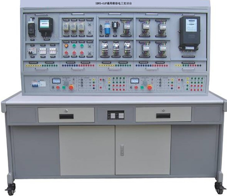 通用维修电工实训台、可进行白炽灯电路接线、日光灯电路接线、触摸开关控制白炽灯电路接线、三相异步电动机直接起动控制、三相异步电动机接触器点动控制电路、三相异步电动机的两地控制等实训考核。"电气考核实训装置"是根据劳动和社会保障部颁发的维修电工初、中级技能考核内容所列出的实训线路而研发的实训装置,通过本实训装置的实训操作,快速掌握该课程的实际应用技术与操作技能,该实训装置不仅可供学生进行技能实训,也是大中专院校、技校、职校及劳动职业技能鉴定部门初中级维修电工技能考核的理想设备。