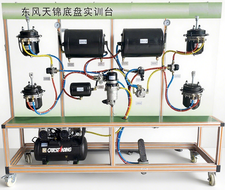 1.天锦全车气路实训台采用全新东风天锦EQ1120GA2  原车零部件有空气压缩机总成、空气干燥剂、前桥储气筒、后桥储气筒、手制动储气筒、再生储气筒、辅助储气筒、四回路保护阀、制动脚阀、驻车阀、继动阀、制动管路、气压表若干个。