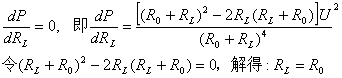 根据数学求最大值的方法,令负载功率表达式中的RL为自变量,P为应变量,并使dP/dRL=0,即可求得最大功率传输的条件: