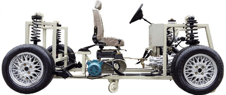 包括汽车前后悬挂系、转向系、传动系、手动变速器及挂档机构、制动系等系统、安装脚轮的可移动式台架等组成。