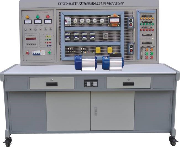 网孔板型万能机床电路实训考核鉴定装置主要由实训屏、网孔板、实训元器件、实训桌组成。结构合理、外观新颖,元器件在网孔板上合理安装、线路的合理布局,全部由学生自行完成,接近工业现场,有效培养学生实际操作技能。所配置的元器件能完成"工厂电气控制"、"电机拖动"、"控制线路与技能训练"、"常用机床控制线路"等课程的实训与考核,增加元器件能扩展"电工技能实训"、"电工仪表与测量"等课程的实训,其适合大中专院校、职校、技校实验室的新建、扩建或实验室的更新换代,也可作为电工考核的考核设备。