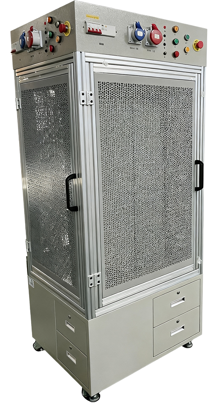 底柜采用≥2mm厚冷轧钢板折弯焊接制成,表面经酸洗磷化后,静电喷塑完成,整体需美观大方,结构轻便,产品耐压,强度大、抗冲击不易变形,底部要求配有底脚及转轮,方便固定及移动;中间实训面由≥1.5mm厚冷轧钢板折弯、焊接、冲孔后内嵌于实训框中,表面静电喷塑;电气单元采用≥1.5mm厚冷轧钢板折弯焊接制成,表面经酸洗磷化后,静电喷塑完成,每个工位提供:≥1个断路器(带漏电保护模块);≥1个欧标380V 16 A插座,≥1个欧标220V 16 A插座,安全插口 ≥3个(24V、0V、PE),≥1个熔断器(控制线路保护),≥1个急停开关,≥1个红色启动指示灯,≥3个电源指示灯。