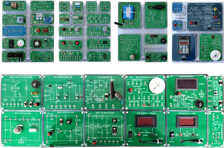 汽车电工电子实训模块由透明封闭元件盒及PCB板构成。元件盒体由透明有机工程塑料注塑而成,具有示教功能,使用者能够观察到元件形状和接线方式,有利于教师讲解和学生认识;面板采用PCB制作而成,表面清爽、符号线路清晰、元件更换容易。