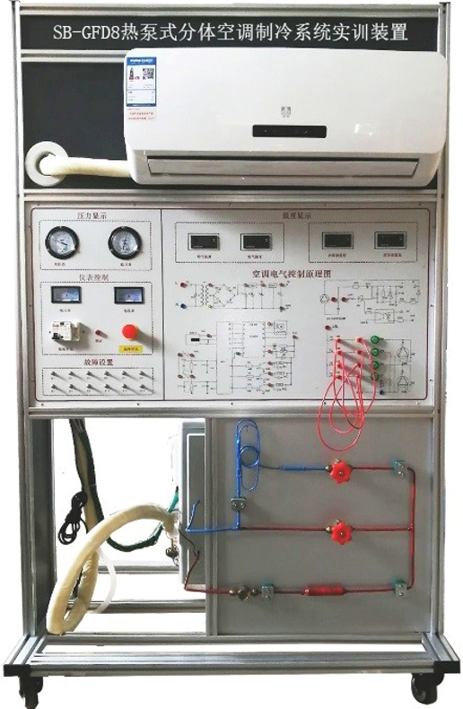 热泵式分体空调制冷系统实训装置是为大中专院校的制冷空调专业、各技能培训及全国职业技能鉴定部门开发设计的,适用于"制冷原理及应用""制冷空调技术""制冷空调设备维修与操作"等教学实训要求。该装置集制冷系统、电气控制系统、故障模拟系统为一体,布局合理、造型美观大方。