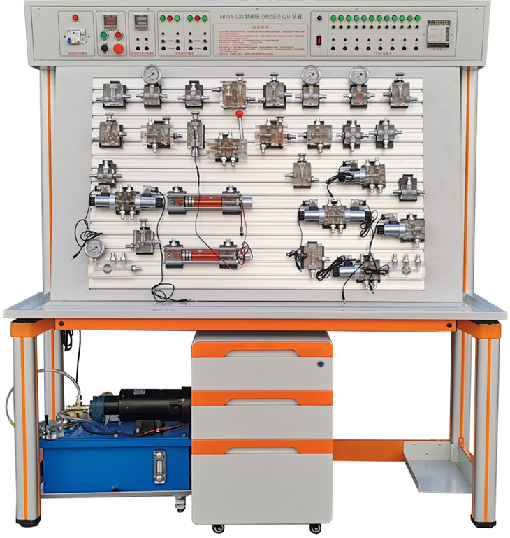 液压控制综合实训装置,液压综合实验台透明液压元件均采用进口透明有机玻璃材料由数控加工中心加工制作而成,可清晰直观的观察和了解到液压元件的内部结构及液压传动回路的工作过程。该装置既可对单个液压元件的结构、工作原理及性能进行实验教学,也可以对常见基本回路进行实验演示学习,同时也可以进行液压系统的课程设计和毕业设计。