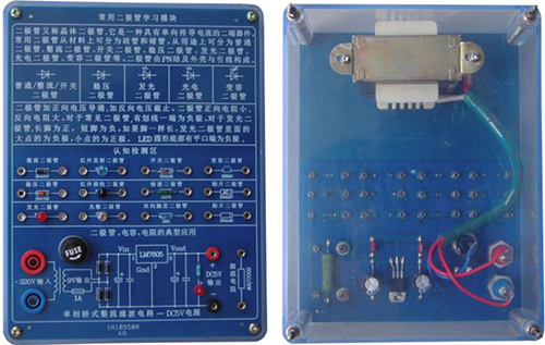 底盒使用190mm×145mm的开模有机透明塑料底盒,模块面板采用印制电路板PCB工艺,可以直观看到器件的实物及相关的原理介绍。对于易损器件安装在面板背面,透过透明底盒能够看到器件实物,方便感性认识、检测测试,同时也能防止器件的损伤。